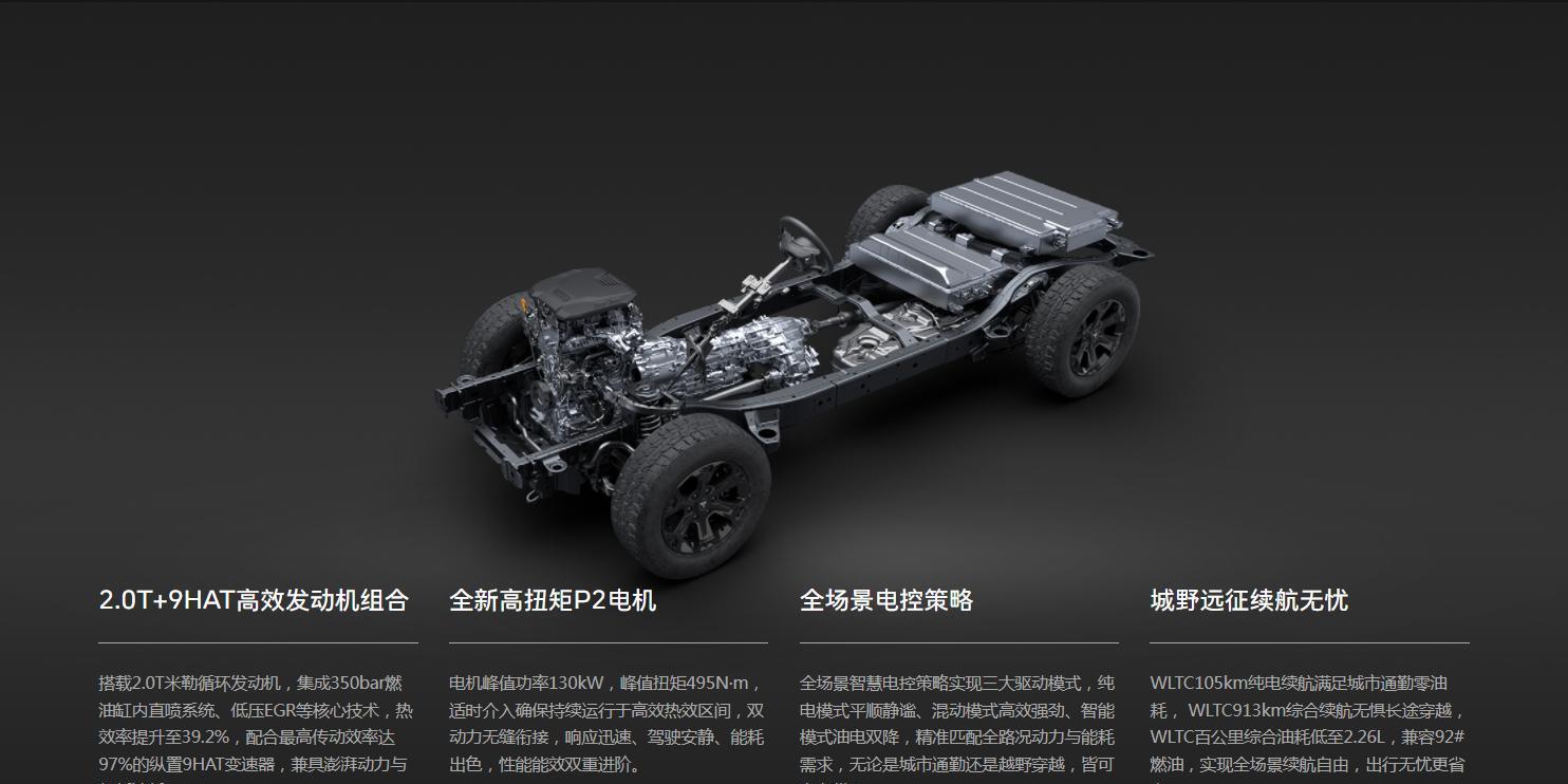 动力系统是此次改款的另一大核心亮点。之前出现在坦克500上的Hi4-Z动力系统,这次也被下放到了坦克400上。这里需要简单区分一下坦克品牌的两套混动系统。我们熟悉的Hi4-T系统,定位是强越野,它采用非解耦的机械结构四驱系统,越野能力非常强悍。而新的Hi4-Z系统,则更侧重于“泛越野”场景,它具备电动四驱的能力,但没有传统的机械四驱结构,更注重公路性能和经济性。至于燃油版车型,则继续搭载2.0T汽油发动机配合48V轻混系统,以及2.4T柴油发动机。传动系统均匹配9AT变速箱,动力参数与现款保持一致。