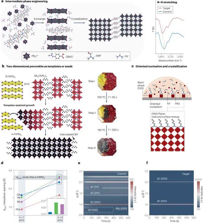 调控晶体生长:钙钛矿薄膜的快速结晶易导致缺陷和不均匀性,影响器件性能与稳定性。有机A位阳离子通过其可调的分子结构与功能基团,可介入成核与结晶过程,具体机制包括:中间相介导结晶、二维钙钛矿模板诱导结晶、以及无中间相的定向成核结晶。例如,图3a展示了GBAC(胍基苯甲酸盐酸盐)通过氢键与FA⁺形成中间相,延缓结晶并提升薄膜质量;图3b显示BA₂FAPb₂I₇作为模板诱导α-FAPbI₃外延生长;图3c则说明PAD⁺通过降低(100)晶面表面能促使定向结晶。烷基链长度、芳香环共轭程度、杂原子取代等结构特征均会影响阳离子的自组装行为与结晶路径。